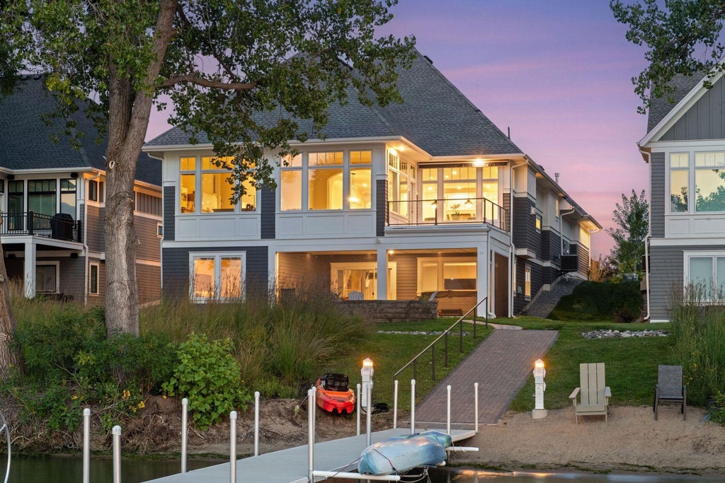 Welcome to the Shores of Lake Waconia, an exclusive community of luxury detached villas offering easily accessible, dedicated dockage and a sandy lakeshore on Lake Waconia. Crafted by Charles Cudd in 2022, this architecturally designed villa showcases panoramic, west-facing lake views from nearly every room, and a bright, open interior designed for both everyday comfort and effortless entertaining. The main level features a gourmet kitchen with informal dining, a welcoming great room with fireplace, and an oversized sunroom with a wall of windows leading to the lakeside deck. The walkout lower level expands the living space with an entertainment-style family room featuring a wet bar and amusement area, flex room, and guest accommodations. Outdoors, enjoy a phantom-screen porch with a hot tub, gas fire pit, and easily accessible shoreline with shore power and water. With association-maintained dockage, lawn care, and snow removal, this home is truly turnkey for both seasonal getaways and year-round living. A custom elevator effortlessly connects the main and lower levels. Community amenities include a playground, private beach access, and walking paths that lead directly to downtown Waconia.