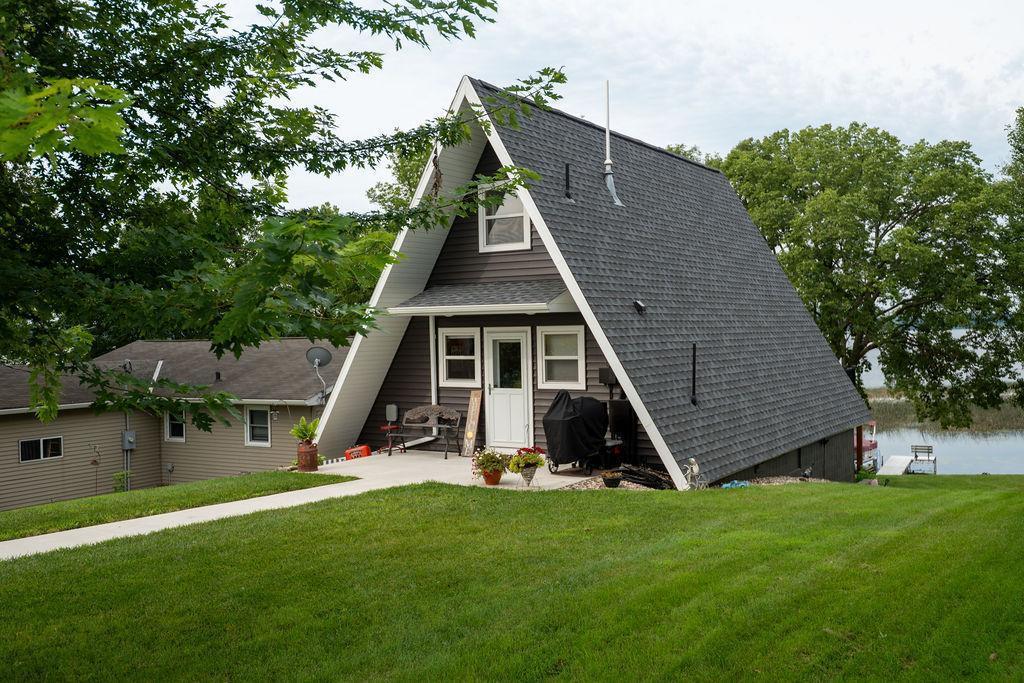 This A-frame house on the east side of Diamond Lake has 3 bedrooms and 2 bathrooms in the main house with another bedroom suite with a brand new 3/4 bath in the area above the 2 car garage. The main house provides a finished, walk-out basement with 2 bedrooms. a full bath, laundry, utilities and several storage options. The loft with a bedroom and sitting area is above approximately half of the main level and is accessed by alternating tread stairs. The spindle railing was recently replaced providing added safety and modern aesthetics. Main level has another full bath along with an open kitchen and living room with vaulted ceiling and patio doors leading out to the low maintenance deck for a beautiful view of the lake, the back yard, and the sunsets. The house sits on a quarter-acre lot with 50+ feet of lakeshore and includes 2 apple trees and 1 pear tree. The most recent improvements include the roof, gutters, siding, doors and storm doors all replaced about 2 years ago. The concrete sidewalks and central air unit were replaced about a year ago along with the loft railing and lighting. The 2025 project has been getting the bunk house ready for added living space including the new bathroom with glass-door shower, electric heat and updated electric for this space and the garage. Please note that the four bedrooms are each unique with special yet unconventional characteristics: walk-out basement with spiral staircase, loft with alternating tread stairs, and guest suite which is separated from the main house.