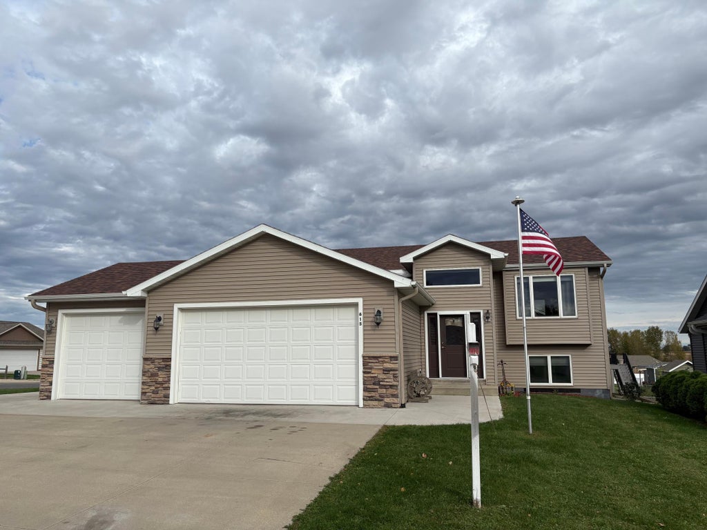 Walk-out split level home with 3 stall, attached garage. The large foyer is an inviting entry to this beautiful home! Open floor plan kitchen/dining/living areas with vaulted ceiling. Laminate flooring on main level. Primary bedroom and dining room offer separate access to the deck. Walk-out lower level features a huge family room with LVP flooring, and finished, framed in fireplace rough-in. Large full bath with jetted tub. Patio and deck to the east provides shade to the backyard on the warm evenings! Added cement around garage provides additional parking and large patio space. Nice corner lot!