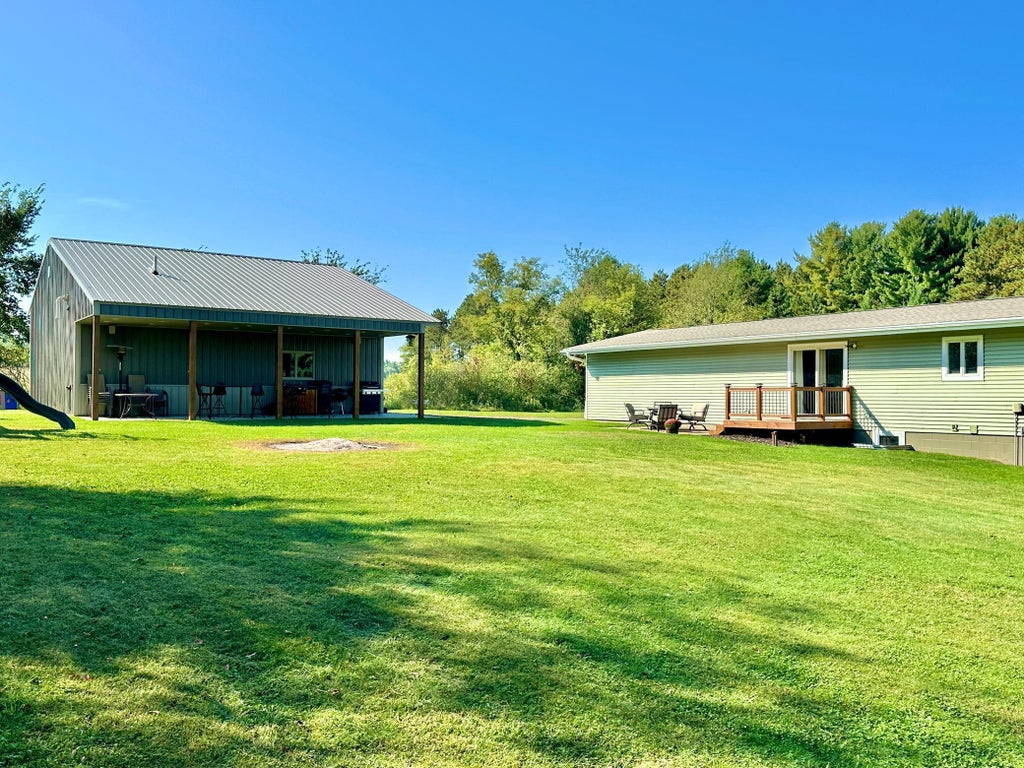 An incredible opportunity awaits in New Richmond! This four -bedroom, two-bath rambler is ideal for anyone seeking a beautiful family home with an outstanding workshop space. Located on a secluded, one-acre wooded lot, this property provides the perfect private escape. The main floor is an open, inviting space with a vaulted ceiling, connecting the living room and the stunning, newly remodeled kitchen. Prepare meals on the sleek granite counters and enjoy the modern appeal of stainless steel appliances, white cabinetry, and butcher block island. The home features a functional layout with two bedrooms and full bath on the main level. The beautiful oak staircase leads to the lower level which has been thoughtfully updated and includes a cozy family room, two more bedrooms with egress windows, and a brand-new 3/4 bath. The walk-out basement adds convenience and easy access to the backyard. The private backyard is home to a massive 36x32 pole shed with a 10x32 lean-to, perfect for a business owner, hobbyist, or car enthusiast. The heated floors, running water, and a built-in car hoist make this a one-of-a-kind workspace. The lean-to is not your typical lean-to, it offers an awesome entertaining area with lots of recessed lighting, concrete patio space and surround sound. Enjoy your morning coffee on the small, maintenance-free deck, taking in the serene, wooded surroundings. This property offers the perfect combination of tranquility and functionality. All but 2 bedrooms have been meticulously remodeled, rim joists have been spray foamed, walls and ceilings have been redone. Also an oak staircase to the lower level. Butcher block island, in-floor heat in main level bath.