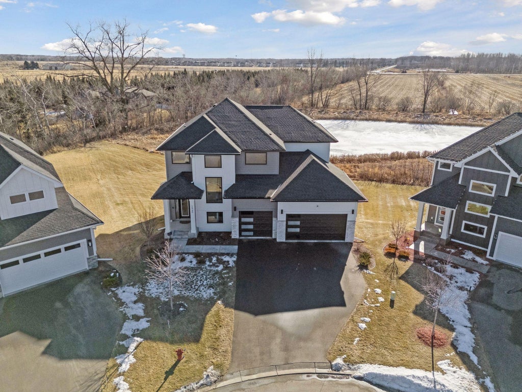 This fully custom home blends striking modern architecture w/ thoughtful design at every turn. From the moment you step into the foyer, you’ll be greeted by soaring 19’ ceilings, a stunning chandelier, sleek modern staircase spindles, & walls of oversized windows that flood the space w/ natural light. The main level features 10’ ceilings, 8’ solid-core doors, & a chef-inspired kitchen w/ fully custom cabinetry, commercial-grade Thermador appliances, built-in beverage cooler, & an espresso machine. A quartzite waterfall island, backsplash, & countertops serve as the true centerpiece. Double ovens & a spacious walk-in pantry make this a kitchen built for both entertaining & everyday living. A main-level bedroom, currently used as a home office, adds flexibility. Upstairs, you’ll find generously sized rooms w/ 9’ ceilings, while the lower level offers even more living space — complete w/ a flex room, wet-bar rough-in, guest bedroom, & ¾ bath. The walkout design leads to a large private backyard w/ serene pond views & additional privacy from the adjoining farmland. Every detail has been elevated, from custom built-in closets & modern light fixtures to porcelain stone flooring & oversized Andersen windows throughout. Even the garage doors have been upgraded to 8’ height for added convenience. Situated on a .39-acre homesite, this property offers both luxury & privacy — a truly special place to call home.
