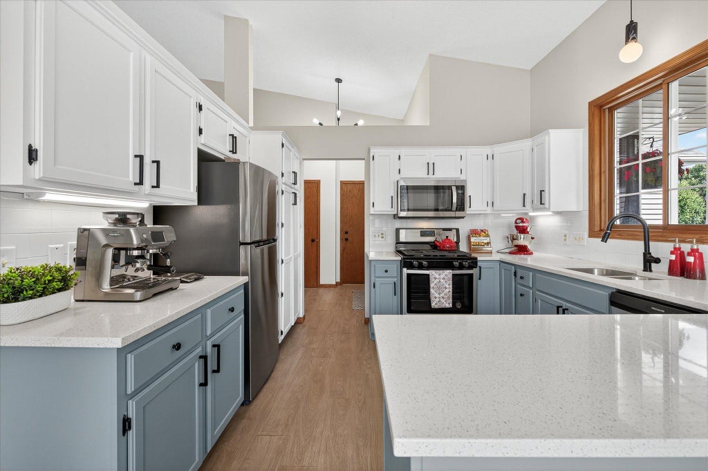 Welcome home to this superb four level split situated in a quiet neighborhood in a fantastic Lakeville location! You will love all the wonderful upgrades this home has to offer. Updated flooring on the main level and an upgraded kitchen with quartz countertops, white enameled cabinetry and SS appliances. Enjoy three bedrooms and two full bathrooms on the upper level (including a private primary en-suite). All bathrooms have been updated. The home has a wonderful floorplan and brings in tons of great natural light throughout. The lower level offers the 4th bedroom and 3/4 bathroom plus a generous sized laundry/ storage room. You'll love the newly designed office in the 4th level with beautiful built-in shelving. The home features large room sizes, a gas fireplace, large deck, freshly landscaped yard, newer mechanicals and an irrigation system. 3 car garage too! ISD 196 schools. Move in and enjoy all this home has to offer!