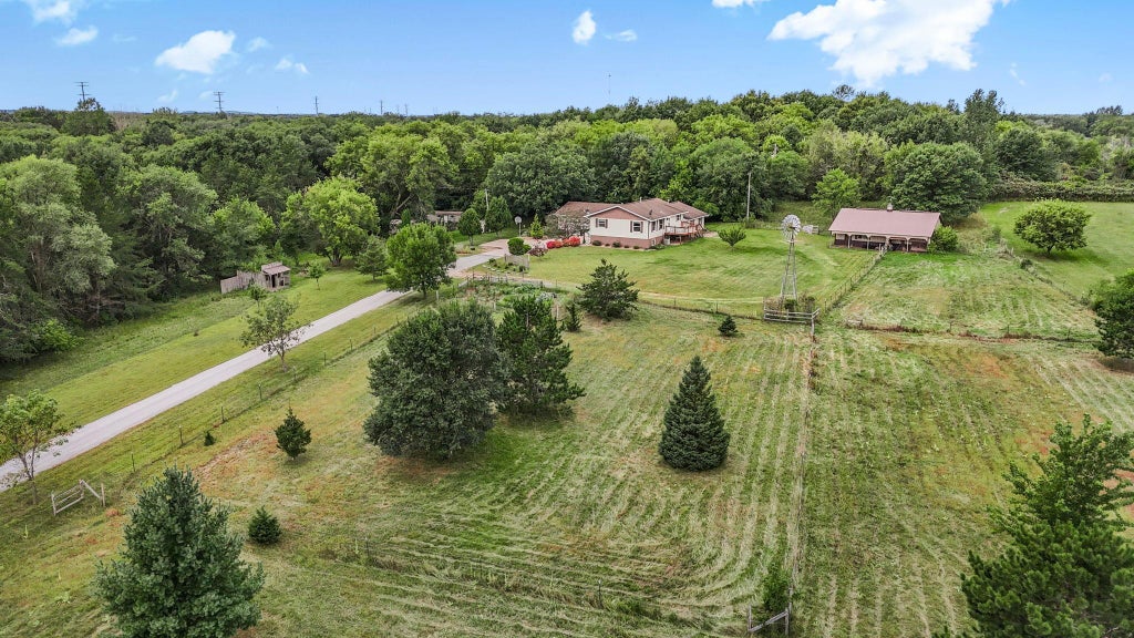 Enjoy the freedom of country living without sacrificing convenience in this nicely updated, walkout Rambler home set on 5 acres! Easy access to Hwy 15 & I94. Built in 1985 this rambler offers updated kitchen w/new flooring and freshly painted cabinets and walls. Good size dining room w/door leads to wood deck overlooks fenced in yard and 36x40 shed and 28x40 lean. Good size living room w/lots or natural lighting. 3 same floor bedrooms, updated 3/4 bathroom and laundry area. Lower level offer 2nd kitchen, large family room, 2 bedrooms and full bathroom w/gas hookup for washer & dryer. But Wait There's More !! Private entrance family room offers wet bar plus plumbed in gas stove. Large office with a closet, carpeting. Another full bathroom that has been updated and 3rd laundry area w/floor drain. Over 3000 sq ft finished, vinyl siding, CA, 2025 furnace, new kitchen faucet, custom tile shower, new vanity. Mature trees include the following Pear, Cherry & a couple of Crab Apple trees. Now for the garage 11 foot ceilings, Attached garage is 40x26 that has been altered and can easily changed back to garage (26x26 was used as an office/studio) But if you need office space this is it partially heated & ac unit and with a half bathroom. 28x40 shed with a 8x40 lean making the overall measurements 36x40 shed w/2 stalls and 100 Amp. 8x20 chicken coop, 8x10 garden shed w/wood floor. Exposed Aggerate patio w/pergola and pond. What A Great Place To Call Home!