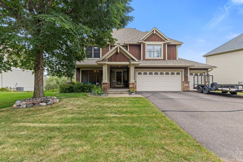 Welcome to this stunning 2-story home in the highly desirable Savanna Grove neighborhood of Blaine! From the charming front porch, perfect for morning coffee, to the private backyard retreat, you’ll fall in love with every detail. The main level offers a formal dining room connected to the spacious kitchen by a butler’s pantry for extra storage. Expansive quartz countertops, stylish backsplash, and updated appliances flow seamlessly into the informal dining space and inviting living room with a cozy fireplace. Upstairs you’ll find 4 generous bedrooms, including a primary suite with a walk-in closet and private full bath. The finished lower level walkout adds a 5th bedroom, a game/puzzle area, and a family room designed as a theater with premium built-in speakers, noise-reducing insulation, and a second fireplace. Built-in storage holds up to 56 totes for exceptional organization. The oversized heated 3-car garage is EV-ready. Outside, enjoy a flat yard with stamped concrete fire pit area, patio, and spacious deck—perfect for entertaining! This one has it all so don't wait on it!