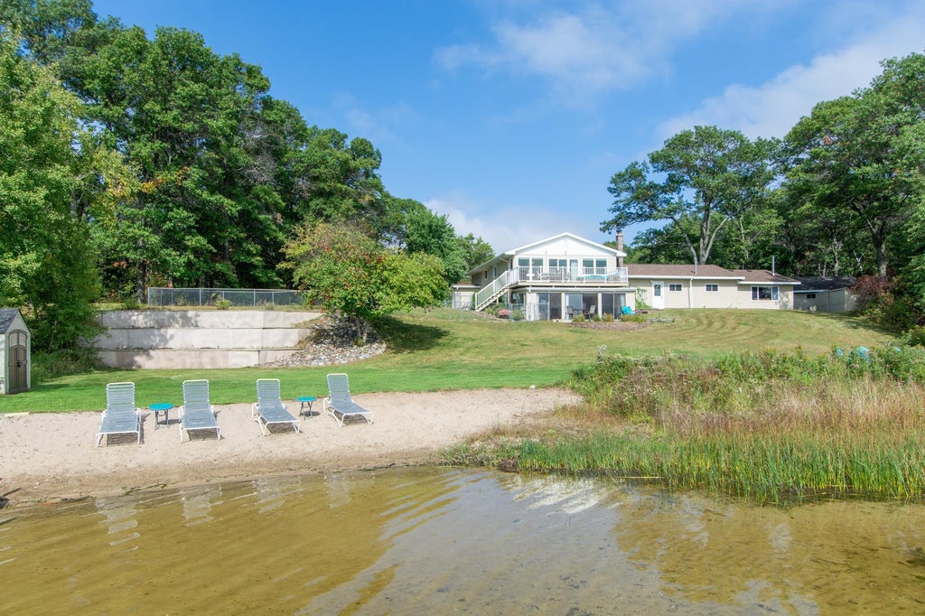 Welcome to your dream lake home on Red Sand Lake – a private paradise offering 242 feet of pristine, sandy lake frontage and 1.38 acres of beautifully maintained land. Wake up to breathtaking sunrises and sweeping lake views in this spacious 5-bedroom, 3-bath home, thoughtfully updated and loaded with amenities for year-round enjoyment. Exterior Features: Crystal-clear lake frontage with a sandy bottom – ideal for swimming and water sports, Outdoor pickleball/sport court for active living, Expansive deck spaces perfect for entertaining and relaxing, Firepit area with new rock, tarp, and edging (2021), 2-car heated/insulated attached garage + 2-car detached garage, New roof (2023) and fresh exterior paint (2021), Gutter guards installed (2023) Interior Highlights: Open-concept main level with lake views from nearly every room, Large living room overlooking the water, Gourmet kitchen with stainless steel appliances, center island, refinished wood floors, and updated ceiling (2023), Sun-filled dining and living spaces with many windows facing the lake, Primary suite with ¾ bath that has heated floors and ample closet space, Two additional main-level bedrooms and a full bath, Spacious mudroom/entry with added closet space. Lower level features:, Cozy family room, Lake-facing sunroom, Rec/game room, Sauna, Two additional bedrooms and a ¾ bath with heated tile floors, Dedicated laundry room, Recent Improvements (Since 2019): Interior: All walls and ceilings painted, New carpet throughout (2022), Anderson Renewal windows (west side), Ceiling fans in entry and all upper bedrooms, Updated lighting throughout, Kitchen & Main Living Areas: Suspended ceilings removed, New dishwasher (2023), Nickel gap ceiling added (2023). Bathrooms: Upstairs & basement bathrooms fully updated (vanities, mirrors, lighting, fixtures, ceilings, etc.) , Master shower door and faucets replaced (2020), Bonus/Game Room: Fully painted and trimmed, New lighting and window treatments, Ceiling and venting updated (2023). Laundry Room: Ceiling removed, cabinets painted, new lighting and hardware. Mechanical: New sump pump and wall drainage (2025), Grinder pump replaced (2023) Entry: New LVT flooring (2023). Whether you're looking for a family home, lakefront retreat, or entertainer’s paradise, this beautifully updated property on Red Sand Lake has it all — space, style, privacy, and recreation. Schedule your private showing today and experience lakeside living at its finest!