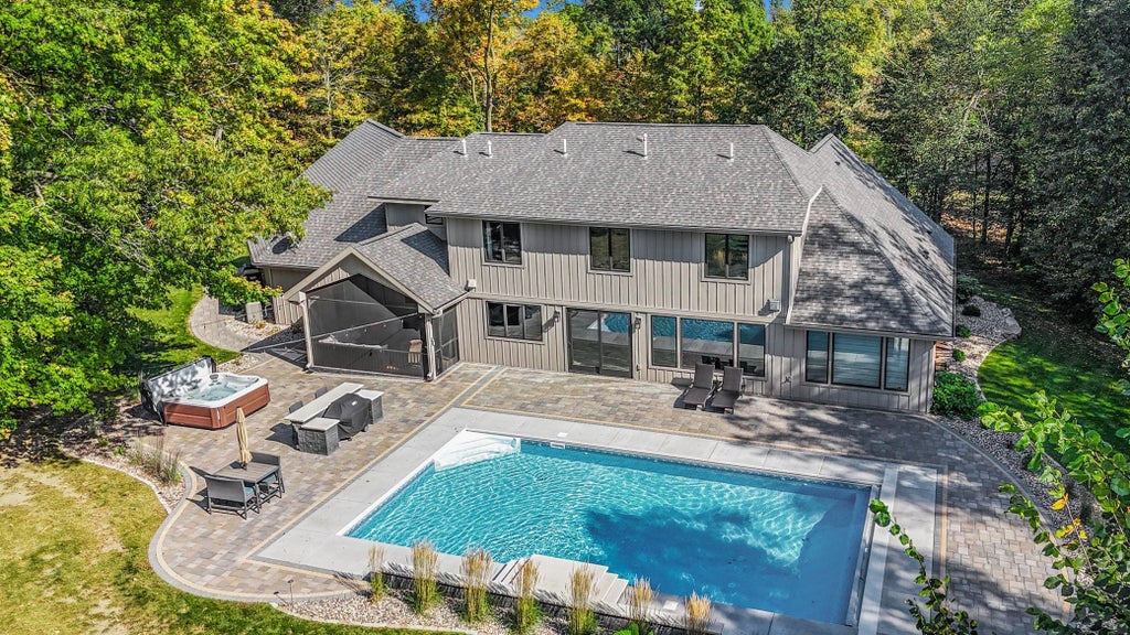 Nestled at the end of a quiet cul-de-sac on a private, wooded lot, this luxury home is filled with high-end upgrades and cutting-edge smart home features. Highlights include a covered front entryway with vaulted ceilings, recessed lighting, built-in speakers, and warm stone accents. The exposed aggregate concrete and seamless rain gutters hint at the quality throughout, while architectural shingles and vertical metal siding offer a sleek yet durable exterior. Built-in security cameras and soffit lighting add both peace of mind and elegance. The heated, fully finished attached garage features three insulated 10-foot-wide overhead doors, each with LiftMaster belt drive openers (smartphone-controlled via the MyQ app), the garage is equipped with floor drains, built-in cabinets, a stainless utility sink, hot and cold water faucets, and even in-floor heat. Above it, a cozy bonus room also enjoys in-floor heat—ideal for a guest suite or game room. Dual service doors lead to the landscaped backyard oasis. Enjoy spring, summer and fall in the heated 20x40 in-ground pool with waterfall (smartphone-controlled), upgraded reinforced concrete base, and an automatic cover that offers endless summer fun. Nearby, a built-in bonfire area with a natural stone surround, paver-edged walkways, a 7-person hot tub, and a grilling/bar area set the stage for unforgettable gatherings. Mature trees and frequent wildlife visits add a delightful touch of nature. Inside the home, the thoughtful design continues. The main floor features high-end tile flooring throughout—perfect for life with kids and pool days. The kitchen features granite countertops, gas range, pot filler, soft-close cabinetry, undercabinet lighting (controlled by a smart phone), double oven and the island offers two power strip outlets. Just off the kitchen, you’ll find a cozy prep area featuring additional counter space, soft-close cabinetry, a convenient vegetable sink, and a spacious pantry complete with a built-in freezer. Main floor also boasts zoned in-floor heating throughout, Control 4 system, surround sound, and screened porch with vaulted pine ceiling and exposed aggregate concrete. Primary suite overlooks the pool and features a spa-style bathroom with walk-in tile shower and a large walk-in closet with custom organizers. Upper level offers 3 bedrooms with walk-in closets, full bathroom with a double sink, study nook, and bonus room with wet bar and a storage room. The detached heated outbuilding (40’x42') finished section, plus an expansive unfinished area mirrors the quality of the home finishings. Stick-built with frost footings, architectural shingles, and metal siding with shake and stone accents, it features two 12’x12’ insulated overhead doors, wall-mounted LiftMaster openers (MyQ app enabled), seamless ceiling tin, dual-pane house-grade windows, an inline water filter system, dual iron filters for the inground sprinkler system, soft water, two floor drains, and even reinforced concrete floor for a future car hoist. The unfinished vaulted upper level loft is perfect for a future game room or hangout spot, with storage space on both sides. Downstairs, workshop space, a stubbed-in bathroom, and a doggie door expand functionality. Whether enjoying a quiet evening by the fire pit or hosting guests poolside, you’ll love calling this property home.