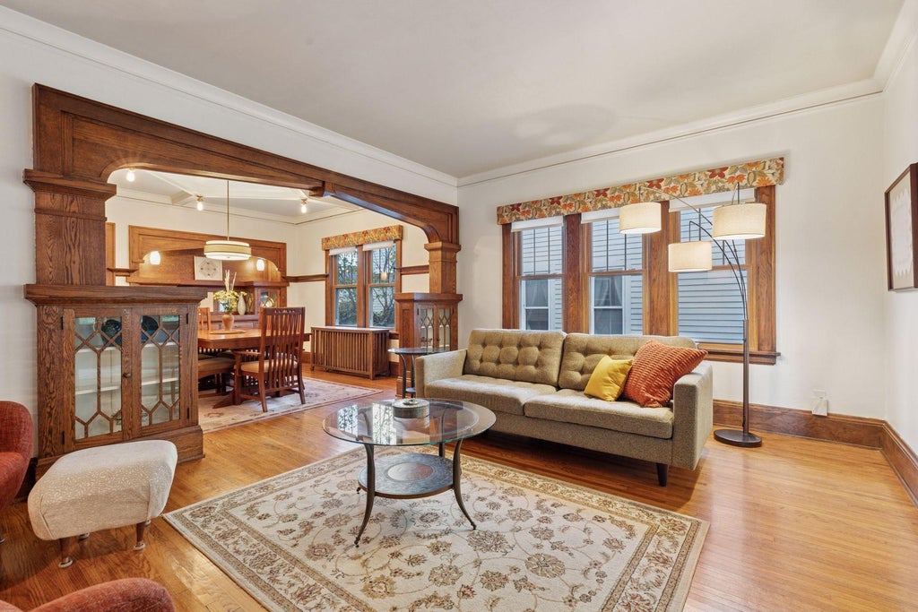 Welcome to comfortable, convenient urban living in this instantly appealing 3-Bedroom/2-Bath main floor condo, nestled on a peaceful street lined with mature trees, yet an easy walk to Grand Avenue and its wealth of shopping and dining opportunities. The private entrance guides you in, and you'll find a breathtaking blend of classic details, original character and updated beauty. Lovely hardwood floors extend from the foyer through to the living room, dining room, sunroom, and kitchen for continuity of design, and rich natural woodwork highlights the old world charm. Gather with family and friends in the handsome living room, accented with eye-catching ceiling trim and wonderful windows to bathe the space in natural light. French doors offer access to the sparkling sunroom, the ideal place to relax with a good book or sip your morning coffee. A distinctive carved wood arched entryway joins the living & dining rooms, with glass front cabinets for your collectibles. The elegant formal dining room will be the scene of many memorable meals, from intimate candlelight dinners to festive holiday celebrations. Note the sophistication of the coffered ceiling and attractive lighting. The beautiful built-in buffet is the perfect place to store and display your fine china and glassware. The sun-splashed kitchen was thoughtfully remodeled in 2023, with rich cabinetry, expanses of quartz-topped countertops and backsplashes, and stainless steel appliances. A double window plus recessed and pendant lighting provide plenty of light. A breezy ceiling fan will move the air on warm summer days, and there is a breakfast bar with counter seating for casual meals. The back entry cabinetry matches that of the kitchen, and leads to a bonus room that could be a reading or exercise nook, then on to the backyard gardens, patio and garage. The main bedroom is spacious and private, rebuilt in 2015, with neutral carpet, built-in shelving, a ceiling fan and bright windows. There is a generous closet, and the copper-colored ceiling adds visual interest and style. Find also two additional bedrooms, each with gleaming hardwood floors. These flexible rooms could function in a variety of ways to suit the changing needs of your household. The spa-like three-quarter bath was completely updated in 2019 with a large step in shower stall accented with gorgeous tilework,a stained glass window, a vanity with granite countertop, and a wood ceiling that reflects the vintage era of the home. The lower level features loads of super storage, a designated laundry, and plenty of space for your workbench or hobbies. There is also a ceramic tiled three-quarter bath. The backyard is an oasis in the city, with a large patio for outdoor gatherings or for summer barbecues. Privacy fencing and gorgeous garden spaces add to the tranquil atmosphere. Your car will be protected in the one garage stall. The association is composed of only two owners who share the common areas of the building and its management. Great location is an understatement! Close to schools and parks, plus an easy commute to either downtown Minneapolis or St. Paul.