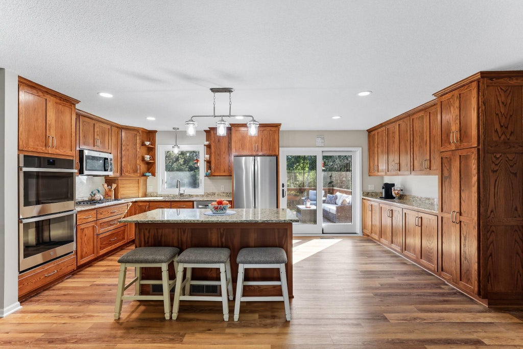 This 4-bedroom home stands out with its beautifully renovated spaces and peaceful private setting. Imagine relaxing on the covered front porch before stepping inside to an open floor plan filled with natural light. The living room flows seamlessly into the dining area and spacious kitchen, where granite countertops, a large center island with breakfast bar, double wall ovens, and abundant cabinet space make cooking and gathering effortless. Most of the windows and the sliding glass door have been recently upgraded, bringing both style and efficiency. Upstairs, the primary suite features a private bath, while the finished lower level offers a welcoming family room with a cozy gas fireplace. Outside, enjoy a brand-new deck with sweeping views of the creek, nature, and wildlife, plus a large backyard with a gravel patio, firepit, and storage shed. With a new roof, modern updates throughout, and easy access to parks, restaurants, and I-35, this move-in-ready home gives you comfort, convenience, and the perfect setting to enjoy every season.