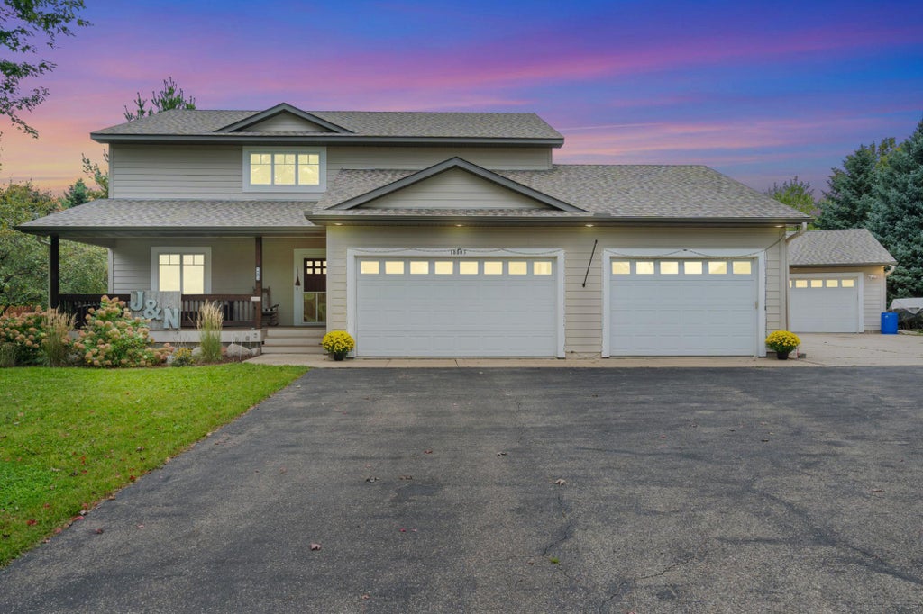 Studious and spacious 6-bedroom, 4-bath home with 6 Garage Stalls! And it's PRICED to SELL! Nestled on a .66-acre, tree-lined corner lot, this 4K+ sfs home is ready to be yours. As you walk past the airy front porch into the ample foyer, it will lead you to the open main floor. With grand 8' ceilings, dim lighting, and an inviting living room, complete with a gorgeous fireplace and floor-to-ceiling windows. The open floor plan flows to the dining room and kitchen, where you’ll find stainless steel appliances, custom cabinetry, a center island, a walk-in pantry, and ample counter space. Off the living room sits an oversized office featuring custom built-ins with a bathroom just around the corner. You won’t want to miss the generous mudroom off of the attached 4 stall garage, with floor-to-ceiling cabinets. Bonus detached 2-car garage just a few steps away. Upstairs, you’ll find the family room, laundry room, and four large bedrooms. The primary suite includes a spacious walk-in closet and a lovely en suite. The upper-level bathroom contains a double vanity and a private split bath. Enjoy the lower level with its large recreation room, a wet bar, two more bedrooms, and a full bathroom. Ideal for entertaining, the backyard boasts a covered deck and a sun-filled patio.