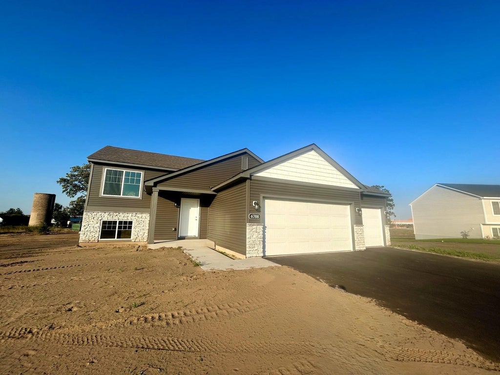 Completed New Construction Split Level Single Family Home Ready for a Quick Closing! NO HOA! This home is situated on a 0.57 acre homesite and features a Walkout Basement and 3 Car Garage! Main level offers an Open Concept Living Area, 2 Bedrooms, and 1 Bathroom. Kitchen highlights are quartz countertops, white cabinets, stainless steel appliances, center island, pantry cabinet, and recessed lighting. Unfinished Walkout Lower Level offers space for a future Family Room, 2 Bedrooms, and additional Bathroom. Sod and Irrigation included! Photos and renderings may not depict actual plan, materials, & finishes may vary. All measurements are approximate.