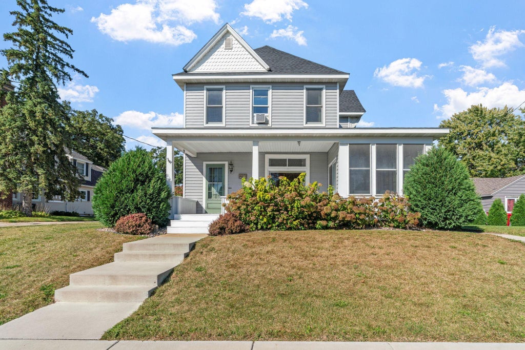 Elegant Historic Home with Gorgeous Modern Updates! This stunning three-bedroom, two-bathroom home offers main-floor-living, designed eloquently to fit today’s style. This home is a show stopper, like in a magazine! You’ll find a spacious kitchen with beautiful dark oak cabinets, solid surface custom countertops and a large deck for grilling and entertaining right off the back. Near the kitchen is an open concept dining room that leads you into a beautiful living room space, family room, also on the main. Currently enjoyed as the kids playroom you can easily convert this cute space back into the main floor bedroom. Three-car insulated detached garage for vehicles and toys in an unbeatable location just steps from downtown shops, dining and amenities. Recent updates make this home truly move-in-ready, including fresh new paint throughout, new boiler, new ac units, roof, siding, water heater, landscaping bushes, new screens on the porch and everything is redecorated throughout to showcase the beauty in this home. Features include nine foot ceilings, hardwood floors, wrap around deck with three-season porch with lots of natural light. Upstairs, enjoy a large master bedroom near the 3/4 bathroom, another large bedroom with bump out window and an additional flexible space used as a nursery, or could be craft room or home office. This beautifully refreshed home combines timeless charm with today’s conveniences. Don’t let it slip away, come see it today!