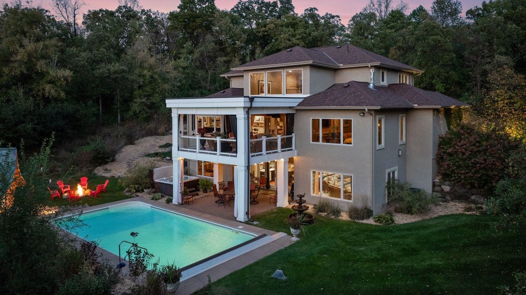 Experience the epitome of refined living in this breathtaking Italian villa nestled in the rolling hills of Hudson, WI. Fully reimagined with uncompromising attention to detail, this captivating residence showcases masterful craftsmanship and a timeless aesthetic- all set on a serene, 3.5-acre parcel just 10 minutes from the boutiques and fine dining of both Hudson and Stillwater. From the moment you arrive, the home impresses with its romantic curb appeal- a stately, maintenance-free stucco exterior framed by a lush climbing vine that arches gracefully over the entrance, welcoming guests with old-world charm and elegance. Inside, the expansive layout is designed for both luxurious daily living and effortless entertaining. The entire home has been meticulously rehabbed with top-tier finishes, including custom solid wood flooring, plush wool carpeting, solid wood white millwork and cabinetry, granite countertops, and oversized windows that flood every room with natural light. At the heart of the home, the grand two-story great room stuns with architectural drama and warmth, featuring a gas fireplace with a hand-carved French-inspired mantle, offering both elegance and comfort. This space flows seamlessly into a spacious den and formal dining room, each with private French doors and direct access to the front patio, while the chef’s kitchen awaits the culinary enthusiast, complete with Viking appliances, custom cabinetry, and space for a breakfast area. Retreat to the main-level Owner’s suite and find a true sanctuary featuring a spa-like en suite, dual walk-in closets, and exclusive access to the king-sized screened porch with sweeping wooded views. The main level also offers a stylish powder room and fully equipped laundry room with built-ins and access to the heated three-car attached garage. Upstairs, two generously sized bedrooms boast full en suite baths, while a fourth en suite bedroom can be found in the walkout lower level that dazzles with a show worthy wet bar and huge theater room with additional bar seating, not to mention an impressive exercise room with Peloton station and a vault room for your dream man cave. Step outside to your private backyard oasis, a tranquil retreat that rivals any resort. The centerpiece is a sparkling in-ground pool, surrounded by an expansive entertaining patio perfect for al fresco dining, sunbathing, or evening gatherings under the stars. Lush, mature landscaping wraps the space in privacy and natural beauty, while a built-in bonfire pit enhances the ambiance into the night. Whether hosting elegant garden parties or enjoying quiet mornings with coffee and birdsong, this outdoor sanctuary offers peace, relaxation, and panoramic views that feel truly priceless. Ideally positioned on a low-traffic street with easy access to WI-35 and MN-36, this exquisite villa offers an unmatched aura in every detail.