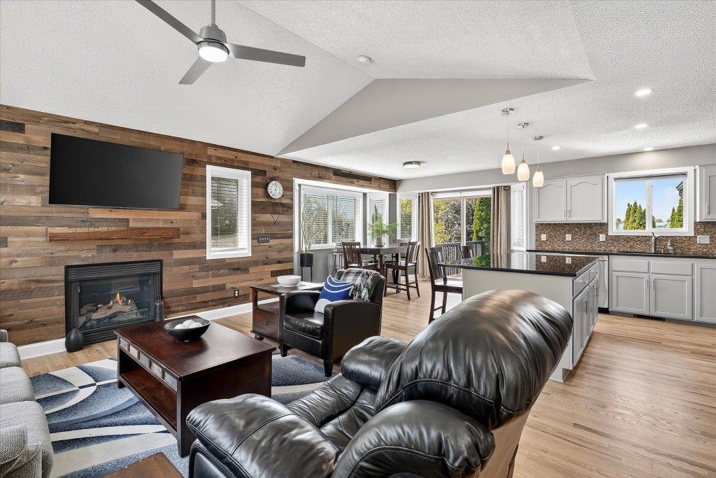 Rare updated spacious walkout rambler on corner lot with beautifully landscaped yard. Remodeled Kitchen w/huge center island w/cabs both sides, granite counter tops, hardwood floors, updated ss appliances, tile backsplash and painted cabinets w/updated hardware + numerous lower pullouts. Open Main Floor features: Vaulted sun-filled Living Room w/refinished hardwood floors, cozy gas fireplace, ship-lap accent wall and lots of windows. Primary Bedroom w/walk-in and 2nd closet, hardwood floors and updated ceiling/fan light. Completely remodeled On-Suite ¾ Bathroom w/custom tile walk-in shower w/glass door, shower panel wall system w/rainfall head and digital temp, tile floor and double vanity w/quartz ctr top. Convenient Main Floor 2nd Bedroom/Office, Full Bathroom, Half Bath/Powder Room, metal spindle railing and Laundry room w/sink. Open Lower level features: Huge walkout Family Room with electric fireplace and Game Room area. 3rd and 4th Bedrooms with Jack+Jill walk-thru Full Bathroom. Spacious storage/utility room. 3 stall high ceiling sheet-rocked garage with plenty of storage. Enjoy summer BBQs on your private patio and deck while enjoying your meticulously maintained level front and backyards. Concrete edging, numerous perennial plants/shrubs and beautiful trees. Underground irrigation system keeps everything green. Quiet stub street next door for added privacy. Move in ready. Close to downtown Rogers restaurants and shopping